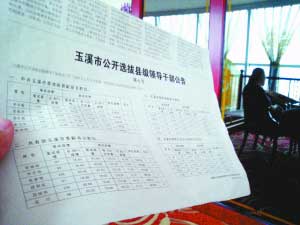 2007年1月,玉溪市要公開選拔4名縣處級干部的消息公布。這四個職位分別是玉溪市統(tǒng)戰(zhàn)部副部長、團市委副書記、市旅游局副局長和市信息產(chǎn)業(yè)辦副主任。
