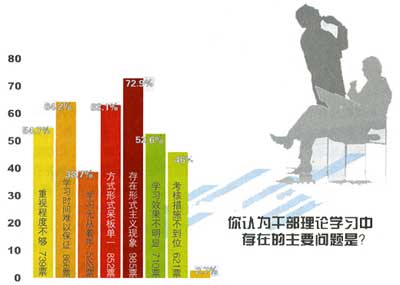 “就你的感覺(jué),干部對(duì)理論學(xué)習(xí)的總體態(tài)度如何?”問(wèn)卷調(diào)查結(jié)果顯示,72.6%的受調(diào)查者表示“只是政治任務(wù),應(yīng)付而已,談不上興趣”或“形式主義嚴(yán)重,可有可無(wú)”!澳阏J(rèn)為干部理論學(xué)習(xí)中存在的主要問(wèn)題是什么?”排在第一位的是“存在形式主義現(xiàn)象”占受調(diào)查者的72.9%。