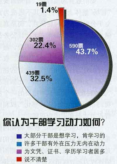 調(diào)查結(jié)果顯示,干部不準(zhǔn)備或不愿意學(xué)習(xí)的原因排在前四位的是:工作太忙、知識(shí)對(duì)工作來(lái)說(shuō)夠用了、學(xué)習(xí)太枯燥、脫產(chǎn)學(xué)習(xí)影響晉升。工作太忙、學(xué)習(xí)時(shí)間難以保證是領(lǐng)導(dǎo)干部認(rèn)為學(xué)習(xí)中面臨的主要問(wèn)題之一,占受調(diào)查者43.6%,排在領(lǐng)導(dǎo)干部認(rèn)為不準(zhǔn)備學(xué)習(xí)的原因之首。干部果真如此繁忙,以致學(xué)習(xí)的時(shí)間都沒(méi)有嗎?部分干部也表示了相反的看法,甚至有受訪者表示,沒(méi)有時(shí)間學(xué)習(xí)只是一種托詞,“時(shí)間就像海綿,擠擠總會(huì)有的”。