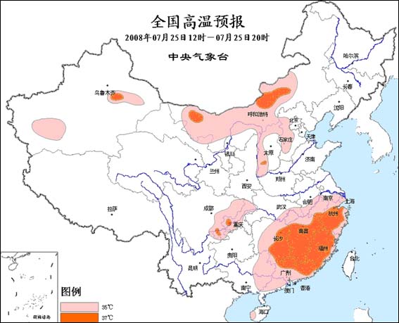中新網(wǎng)7月25日電 中央氣象臺(tái)2008年7月25日10時(shí)發(fā)布高溫預(yù)報(bào):預(yù)計(jì)今天白天,江淮南部、江南大部、華南中東部、四川盆地東部、重慶大部以及新疆吐魯番盆地、內(nèi)蒙古中西部、山西西部和北部、河北西部等地將有35℃以上的高溫天氣.