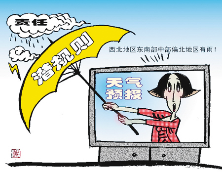 天氣預(yù)報曾被批為“四大不準(zhǔn)”之首,原來氣象專家們學(xué)會了“太極拳”,啟用了“潛規(guī)則”,以一串模糊不清的詞語,讓百姓不知所云,自己無責(zé)一身輕了!這層窗戶紙被“業(yè)內(nèi)人士”捅破后,長期被忽悠、愚弄的觀眾忍不住發(fā)問:每天黃金時間播報,那么多經(jīng)費(fèi)供養(yǎng),竟然貢獻(xiàn)出這樣的東東,這節(jié)目、這專家、這部門還要它干什么?的確,天氣預(yù)報不準(zhǔn)確,百姓會很有意見,但即使報錯了,氣象部門也沒有哪個受到撤職或處分。民憤起于一時,但很快會歸為理性,作為“氣象人”,何必自作聰明用模糊語言忽悠民眾、罔顧己責(zé)呢?