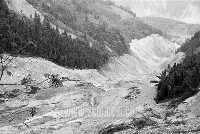 從百花大橋出口處山路行進(jìn)幾公里,到了牛圈溝。進(jìn)入溝內(nèi)不久,專家們被兩邊的情景驚呆了,這里更像是冰川遺跡:一大堆土石組成的固體流從兩公里外的一條支溝傾泄而來(lái),將所過(guò)之處掃得精光,兩道棱角分明的沖刷印跡,如刀削般留在溝兩邊的山體上;山體印跡以上樹林茂密,少有損傷;印跡之下,只有堆堆土石。固體流在傾泄過(guò)程中,曾受到山體阻攔,產(chǎn)生了三次折向,折向處有明顯的上揚(yáng)跡象,最高處達(dá)60米。