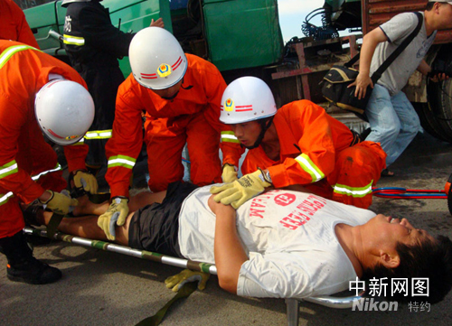 大橋消防中隊(duì)接到報(bào)警后,立即出動(dòng)三輛消防車15名消防官兵趕赴出事地點(diǎn)。8時(shí)36分到達(dá)事故現(xiàn)場(chǎng),此時(shí),空氣中彌漫著濃濃的柴油、機(jī)油味道,發(fā)動(dòng)機(jī)處還向外冒著黑煙。指揮員迅速展開災(zāi)情偵察,組織搶險(xiǎn)車人員利用液壓破拆器材解救被困人員,A類泡沫車人員出兩支泡沫槍滅火掩護(hù),重型水罐泡沫車組織供水。動(dòng)作迅速,操作熟練的消防官兵只用了5分鐘的時(shí)間就成功將駕駛員救出,并在第一時(shí)間抬上救護(hù)車送往醫(yī)院。