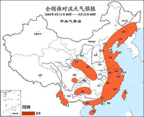 2008年8月11日08時—12日08時全國強(qiáng)對流天氣預(yù)報