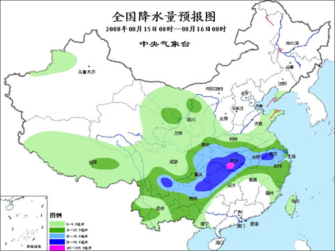 2008年8月15日8時-16日8時全國降水量預(yù)報(bào)圖