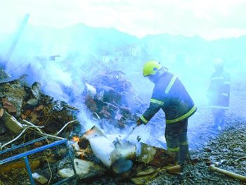 廠區(qū)中心基本被夷為平地,四處斷壁殘?jiān)袼纳,不時(shí)傳出零星爆竹聲。在一面寫著“安全生產(chǎn)警鐘長鳴”的墻壁下躺著五六輛摩托車殘骸。