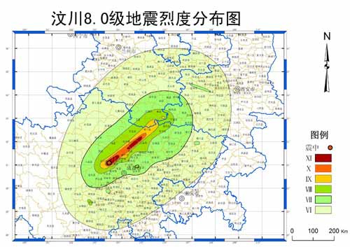 、葏^(qū):面積約2419平方公里,以四川省汶川縣映秀鎮(zhèn)和北川縣縣城為兩個中心呈長條狀分布,其中映秀Ⅺ度區(qū)沿汶川-都江堰-彭州方向分布,長軸約66公里,短軸約20公里,北川Ⅺ度區(qū)沿安縣-北川-平武方向分布,長軸約82公里,短軸約15公里。