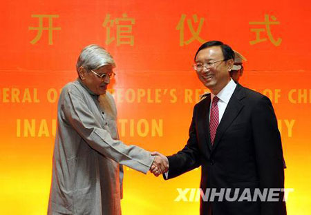 中國外交部長楊潔篪在開館儀式上同印度西孟加拉邦邦長甘地握手