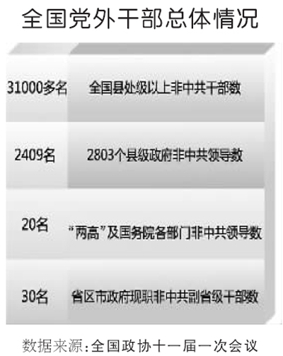 黨的十七大提出,要“選拔和推薦更多優(yōu)秀黨外干部擔(dān)任領(lǐng)導(dǎo)職務(wù)”,非中共干部培養(yǎng)選拔邁上新臺(tái)階。截至目前,全國(guó)擔(dān)任縣處級(jí)以上職務(wù)的非中共干部共3.1萬(wàn)余名,數(shù)量明顯增多,結(jié)構(gòu)進(jìn)一步優(yōu)化。