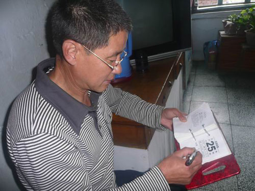 翟志強(qiáng)戴著花鏡計(jì)算著弟弟升入太空的時(shí)間。