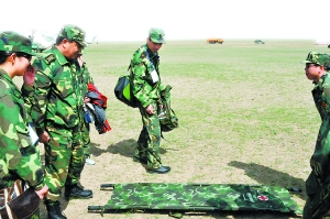 “神七”醫(yī)療救護(hù)隊(duì)在主著陸場附近集結(jié)進(jìn)行有針對性的救護(hù)演練。