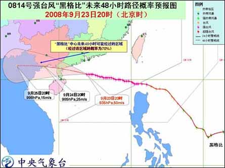 預(yù)計(jì),“黑格比”將以每小時(shí)30公里左右的速度繼續(xù)向西偏北方向移動(dòng),將于24日凌晨到中午在廣東徐聞到陽(yáng)江一帶沿海登陸,登陸時(shí)強(qiáng)度可達(dá)強(qiáng)臺(tái)風(fēng)。