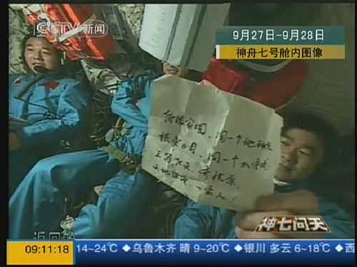 中新網(wǎng)9月28日電 據(jù)中央電視臺報道,昨晚神舟七號上的三位航天員與家人進(jìn)行了天地通話。劉伯明向鏡頭展示的字條內(nèi)容曝光,上面寫著“俯瞰家園,同一個地球村;橫望日月,同一個太空城;三馬飛天,齊祝愿;天地連線,一家人。”
