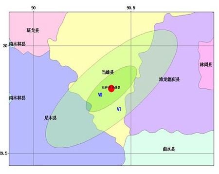 20時46分50.0秒,當(dāng)雄縣(北緯29.8,東經(jīng)90.3)再度發(fā)生3.9級余震,拉薩市有輕微震感。