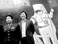 發(fā)布會上首次公布了隨“神七”飛船飛天的100多首歌曲,其中包括全新創(chuàng)作的15首航天歌曲專輯。楊利偉表示,“我深愛《我為祖國感到驕傲》這首歌,每一次聽到都會感到心情激動。那就是我們航天員回到地球打開艙門時最想說的第一句話,是我們的真情感受!北九_晚會的音樂總監(jiān)、蒙族音樂家恩克巴雅爾也是 《我為祖國感到驕傲》的曲作者,他介紹說:“這一百多首歌曲有郭蘭英演唱的《我的祖國》、宋祖英演唱的《望月》以及成龍演唱的《男兒當自強》等。”(記者 李澄/文 鄒紅/攝)
