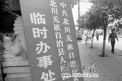 由于北川新縣城選址一直待定,北川縣委、縣政府的駐地在災后數(shù)易其址。從最初北川中學附近的帳篷,遷至北川擂鼓鎮(zhèn)的帳篷。期間,還曾在安昌鎮(zhèn)天龍賓館的大堂設(shè)立臨時辦事處?h里的各委、辦、局則擠在旁邊的一間火鍋店里,甚至“三個單位合用一個桌子”。后來化整為零。縣級61個單位分散租用安昌鎮(zhèn)的民房作為辦公地兼集體宿舍。