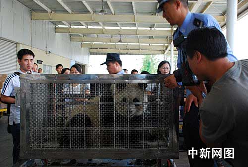 小家伙呆在鐵籠里正被工作人員小心翼翼地抬起來搬到貨車上去。作者:周航健