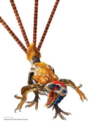 “胡氏耀龍”生活在侏羅紀時期,身體全長超過40厘米,屬于鳥翼類,代表了和鳥類關系最為接近的恐龍之一。不同于其他已知恐龍,“胡氏耀龍”長有4枚長約20多厘米的帶狀尾羽。更有意思的是,它的其他羽毛均未形成為類似鳥類飛羽的構造,雖然“胡氏耀龍”的前肢長于后肢,形成了類似原始鳥類的前肢,但由于沒有飛羽,“胡氏耀龍”并不具有飛行能力。