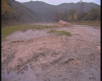 解說:記者來到現(xiàn)場,果然看到一片因尾礦庫泄露的莊稼地.。上面覆蓋著厚厚的礦渣.就在記者正在拍攝時,巨恒公司二廠的人員趕來,阻止了記者的繼續(xù)拍攝。見此情況記者離開了巨恒公司二廠。沿河道向上繼續(xù)了解情況。