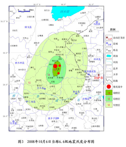 2008年10月6日16時30分(北京時間),西藏自治區(qū)拉薩市當雄縣(北緯29.8°,東經(jīng)90.4°)發(fā)生Ms6.6級地震。地震發(fā)生后,由中國地震局、西藏自治區(qū)地震局和云南省地震局及西藏自治區(qū)相關單位組成的聯(lián)合地震現(xiàn)場工作隊在震區(qū)開展了為期7天的地震災害調(diào)查和損失評估工作,共計行程20000多公里,完成60個居民點和3個地震地質(zhì)災害點的調(diào)查工作,其中抽樣調(diào)查點41個。在震區(qū)各級黨委、政府的協(xié)同配合下完成了地震災害損失評估工作。
