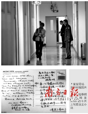 發(fā)言人的介紹,也證明了部分網(wǎng)友博客中的說(shuō)法。網(wǎng)友“夜江湖”稱:“昨晚大家在各宿舍討論案情,一說(shuō)到兇手的專業(yè)、籍貫,馬上就想到一個(gè)人:F某某。一查證,果然就是這個(gè)人,就住在我們樓下。在校內(nèi)網(wǎng)上,還能看到他的照片,長(zhǎng)得很斯文!
