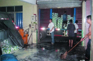 前天晚上7時(shí)許,位于廣州石井潭村附近的垃圾壓縮站內(nèi),先后兩輛大貨車將數(shù)百箱不合格盒裝牛奶運(yùn)送到此然后集中進(jìn)行銷毀。大量液態(tài)奶在這一過程中被直接排放到附近的石井涌內(nèi),附近居民表示因?yàn)樘鞜崤D贪l(fā)酵導(dǎo)致臭氣沖天。昨日,記者再次來到該垃圾壓縮站,已經(jīng)有當(dāng)?shù)卣块T工作人員趕到現(xiàn)場清理,并未有再次銷毀牛奶情況出現(xiàn)。