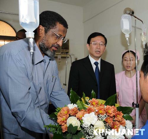 圖為11月2日,蘇丹能源與礦產(chǎn)部長祖貝爾·哈桑(左一)在中國駐蘇丹大使李成文(左二)的陪同下,在喀土穆一醫(yī)院看望在此接受治療的4名獲救中國工人。10月18日,中石油公司9名員工在蘇丹西南部一施工現(xiàn)場被武裝分子綁架,其中5人已被確認遇害,4人獲救。