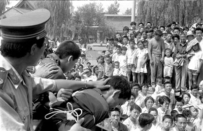 同時(shí),留在人們集體記憶中的,還有公判大會(huì)。劉仁文說,當(dāng)時(shí)被押到現(xiàn)場(chǎng)的犯罪分子,戴著畫了大紅叉的木牌,垂頭喪氣,聽候著聲勢(shì)浩大的審判。臺(tái)下,上萬名群眾都在圍觀,人們竊竊私語,“這不是誰誰家的兒子嗎?聽說搶了幾千塊錢,被判死刑了!