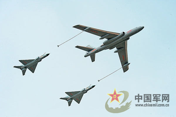 率先登場的是轟油—6空中加油機。遠(yuǎn)遠(yuǎn)望去,只見3個黑點成“品”字形向觀眾區(qū)飛來。不一會兒,飛在前面的轟油—6空中加油機伸出兩根錐套式軟管,兩架殲—8D戰(zhàn)斗機略一加速縮短與加油機的距離,到約1米間隔時保持住速度,緊緊跟隨在加油機左右兩側(cè)。望著在500米高度上慢速飛來的加受油機編隊,現(xiàn)場觀眾雖然知道空中的飛行員根本聽不到地面上的聲響,但仍然報以熱烈的掌聲。