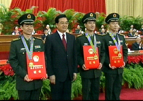 胡錦濤為翟志剛、劉伯明、景海鵬頒發(fā)獎(jiǎng)?wù)潞妥C書(shū)