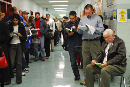 等到孩子們真正長大可以投票的時(shí)候,他們?cè)跓崆楦邼q的同時(shí)又不乏理性。在呂芳的想像中,投票站應(yīng)該是兩方對(duì)壘,支持者搖旗吶喊才對(duì)。結(jié)果卻完全出乎他的預(yù)料。大選當(dāng)天,呂芳所在小組參觀的第一個(gè)投票點(diǎn)在弗吉尼亞Falls Church縣的一個(gè)社區(qū)活動(dòng)中心。他們到那里時(shí)剛過6點(diǎn),投票點(diǎn)外已經(jīng)排起了長龍,蜿蜒足有一二百米。人群中,有人帶著蹣跚學(xué)步的孩子,有人坐著輪椅,有人自己帶著椅子……“但是,整個(gè)人群靜悄悄的,沒有一點(diǎn)激動(dòng)人心的表現(xiàn)!