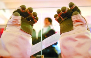 昨日,觀眾在看“神七”航天員艙外使用的手套。