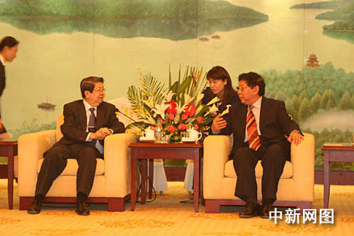 中國政協(xié)副主席鄭萬通在江蘇溧陽會(huì)見應(yīng)邀前來參加二00八年“一村一品”國際研討會(huì)的的柬埔寨王國副首相兼內(nèi)閣辦公廳大臣索安。 作 者:李建軍