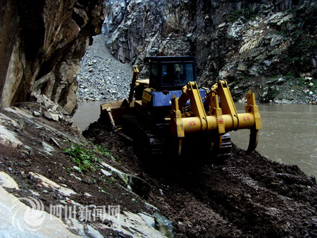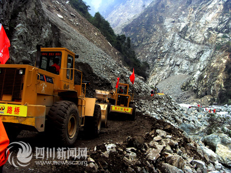 14日S303線耿達至映秀段兩路搶通大軍在蟠龍山隧道出口會師,半年來所有的艱辛隨著盡情的歡呼逐漸遠去。回想昨天,他們面對的是一條處于特大地震震中,蜿蜒在崇山峻嶺、峽谷深溝之中,被汶川特大地震摧毀得面目全非的公路。同時,映日公路耿達至映秀段路段長23公里,有8個堰塞湖,山勢陡峭,根本沒有空曠地帶堆放清除的山體崩坍物,僅僅只有700米路段清除崩坍的巨石后能使用外,其余全部路段被地震摧毀殆盡。曾經(jīng)專家斷言,要重新打通S303線映日公路沒有三年兩載的時間根本不可能。面對如此的艱難險阻,很多親臨現(xiàn)場的專家都稱,四川正在搶通一條世界罕見難度的公路?陀^條件使耿達至映秀段成為最難搶通的一條公路,但是為了恢復(fù)重建,耿達至映秀段的搶通方案幾經(jīng)論證,最終還是決定沿原路線進行搶通。