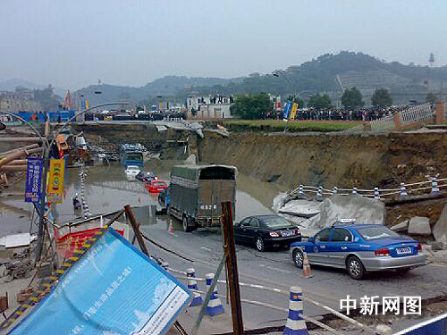 11月15日下午3點15分左右,杭州市蕭山區(qū)蕭山風情大道地鐵一號線出口附近發(fā)生大面積地面塌陷事故,塌陷面積20米寬100米長,深10米,十幾輛車陷在其中。由于附近河水倒灌,塌陷處嚴重積水,增加了救援難度。
