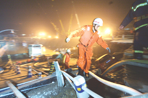 “馬路突然下陷,路面傾斜成了六七十度的坡。我把握不住方向,摩托車直接撞上了路邊的隔離墩。我感覺整個大地都在震動,周圍的塔吊也都傾倒了。”金國飛說,當時他完全懵了,“我第一反應就是拿出對講機向隊里匯報情況。”匯報完情況,金國飛趕緊往路面上爬,然后在現(xiàn)場參與了一夜的救援。