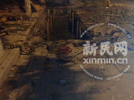 圍觀的居民告訴新民網(wǎng)記者,可能是由于事發(fā)地旁開(kāi)挖的污水處理池在挖掘的過(guò)程中將管道挖破造成的。受爆炸的影響,萬(wàn)航渡路康定路口地面已翹起約7、8厘米。