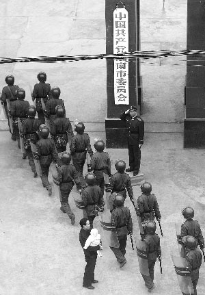 不法分子在前院縱火焚燒了市委保安室和信訪接待室,以及停放在前院的摩托車、自行車和砸壞的辦公用品,并將前來救火的一輛消防車強行搶奪開進大院,后被制止。之后,武警戰(zhàn)士和公安民警將聚集人員清理和疏散出市委大門,凌晨4時左右,事態(tài)暫時得到控制。