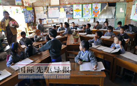 在“西藏兒童村”內(nèi),孩子們?cè)谏险n。