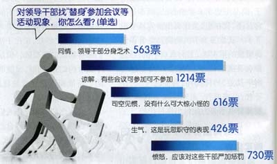 “你認為領導干部找‘替身’開會對工作是否有影響?”問卷調(diào)查結(jié)果顯示,46.56%的受調(diào)查者認為“有影響,規(guī)定‘一把手’參加的會議自有其道理”,24.34%的受調(diào)查者認為“很難說,要看具體情況而定”,29.1%的受調(diào)查者認為“沒有影響,只要將會議的主要精神傳達到了就可以”。