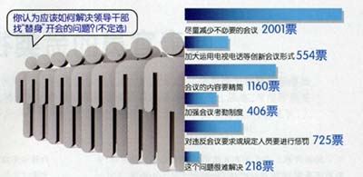86.67%的受調(diào)查干部認為,目前地方會議真正能夠起到實際作用的不足六成;“減少不必要的會議”是受調(diào)查者認為解決“替身”現(xiàn)象的首要舉措