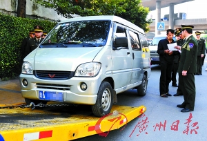 執(zhí)法人員昨日對一輛查獲的非法營運車輛依法進行處理。 記者王燕攝