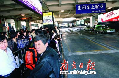 廣州東站剛剛出站的幾百名旅客,不得不密集地站在上客點(diǎn),焦急等待,人龍已經(jīng)排到50米開外的出站大廳,但的士卻不見蹤影(見上圖,楊曦?cái)z)。“平時(shí)我10分鐘就可以上的士了。今天等了30分鐘,還有20多個(gè)人在我前面。不知為何今天的士少了這么多!”一位男孩抱怨說(shuō)。