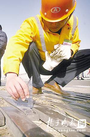 工人正在測量修復(fù)過的大橋接縫的數(shù)據(jù)!∷螎 攝