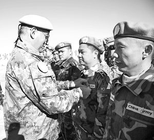 11時整,授勛儀式在莊嚴(yán)的軍樂聲中拉開帷幕。聯(lián)黎部隊司令克羅迪奧將軍在中國維和部隊指揮長李元祥的陪同下檢閱了維和官兵。列成6個方隊的維和官兵,個個英姿勃發(fā),臉上寫滿了自豪與光榮。