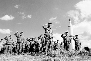 今朝長纓在手,敢縛出海蛟龍。1996年3月,在我國東南沿海舉行的那場規(guī)模宏大的軍事演習(xí)中,一枚枚威武挺拔的新型導(dǎo)彈,在群山環(huán)抱中起豎聳立!包c火!”隨著命令傳出,驚雷搖撼大地,閃電劃破長空,一枚枚導(dǎo)彈呼嘯著飛向預(yù)定目標(biāo)……顯示了中國人民捍衛(wèi)國家主權(quán)和領(lǐng)土完整的堅強決心,展示了第二炮兵的軍事打擊能力。