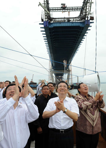 李克強說,中國在一些重大基礎設施方面具有明顯的國際市場競爭優(yōu)勢。他要求有關部門從財政、金融信貸等方面對企業(yè)給予支持。李克強向正在橋上施工的中方工程技術人員和工人揮手致意,勉勵他們保證質(zhì)量,注意安全,高標準地完成建設任務,不負祖國的托付,把大橋建成中國和印尼人民之間的友誼之橋。