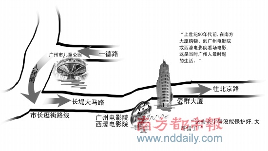 離開兒童公園,張廣寧沿人民南路向南走去。當(dāng)看到廣州電影院和西濠電影院的招牌時(shí),張廣寧還回憶說(shuō),上世紀(jì)90年代前,在南方大廈購(gòu)物、到廣州電影院或西濠電影院看場(chǎng)電影,這是當(dāng)時(shí)廣州人最時(shí)髦的生活。眼前,廣州電影院已變成一家KTV,而西濠電影院則變成了一家網(wǎng)吧。見此情此景張廣寧立即要求致電主管部門,了解這幾家老字號(hào)的產(chǎn)權(quán)及消失原因。