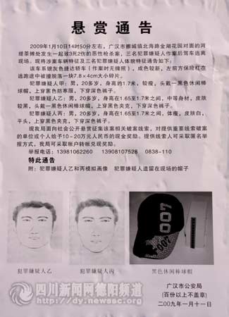 13日上午,記者在廣漢各大街道、小區(qū)看到,廣漢市公安局貼出了懸賞通告,向社會(huì)公開懸賞征集廣漢市“1.10”惡性槍殺案相關(guān)破案線索,對提供重要線索的單位或者個(gè)人,將給予10-20萬人民幣現(xiàn)金獎(jiǎng)勵(lì)。提供線索人可以匿名舉報(bào)方式。舉報(bào)電話:13981062260、13908107528、0838-110(記者 李安國)