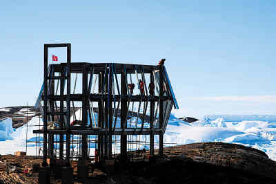 溫度、風(fēng)速、氣壓這些天氣數(shù)據(jù)實時地顯示在餐廳內(nèi)的液晶電視屏幕上。這兩天早上的風(fēng)刮得都比較緊,今天的風(fēng)就有六七級,陣風(fēng)8級。地處東南極大陸沿海,中山站正在南極大陸平均風(fēng)力最大的區(qū)域內(nèi)。去年冬天最大風(fēng)速曾達(dá)到40多米每秒。中山站改造項目經(jīng)理劉篤斌決定等風(fēng)小一些再讓隊員們?nèi)ヅ栏吒苫。對于站上接二連三立起來的鋼結(jié)構(gòu)新樓,老劉一拍胸脯說,“基礎(chǔ)打得特別深,再大的風(fēng)也能頂?shù)米。 ?/p>